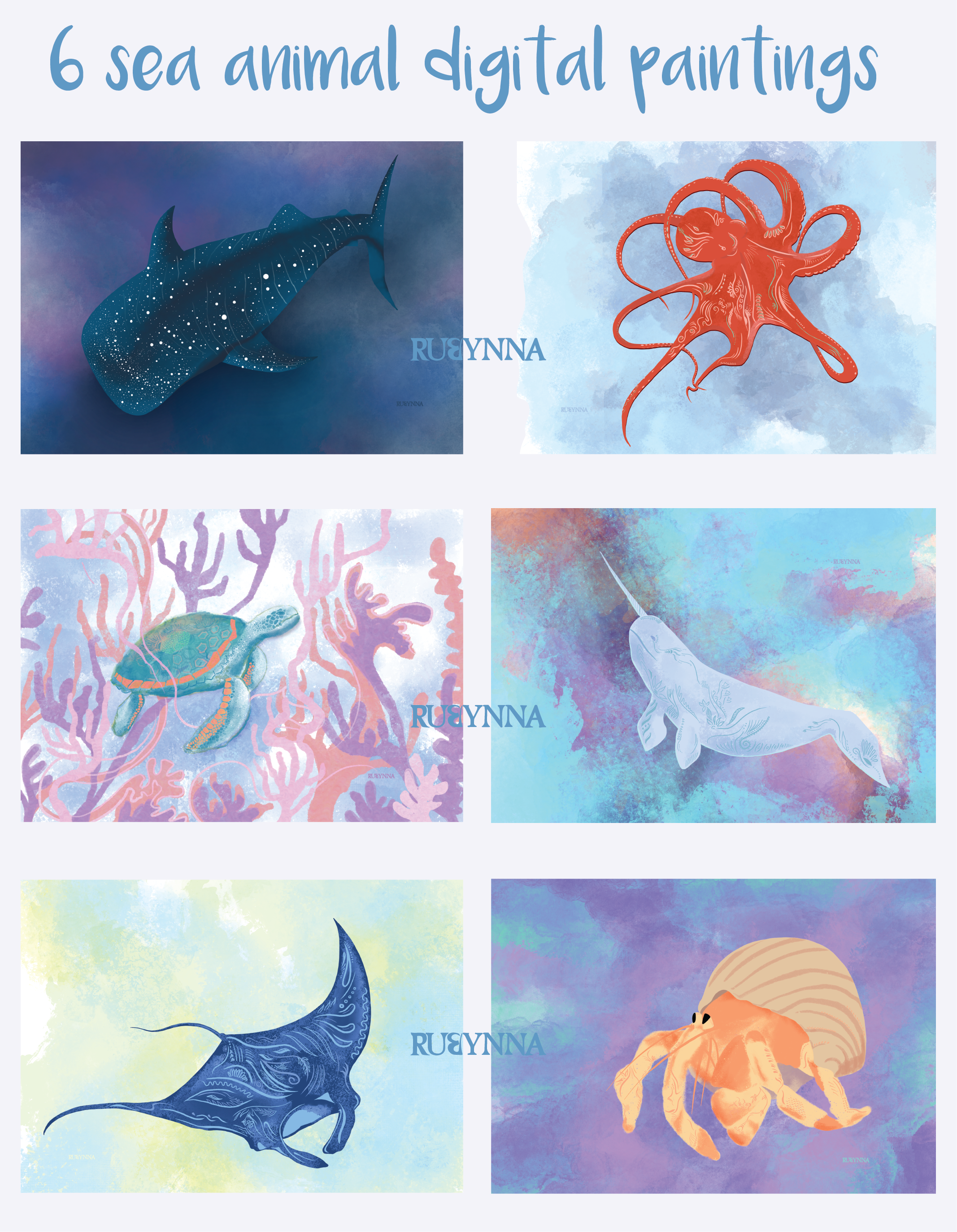 Illustrations of sea animals with doodles on their bodies. Very minimal with pastel shades, something magical to add to your walls.